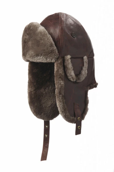 Sheared beaver aviator with antiqued lamb cover and chin strap.