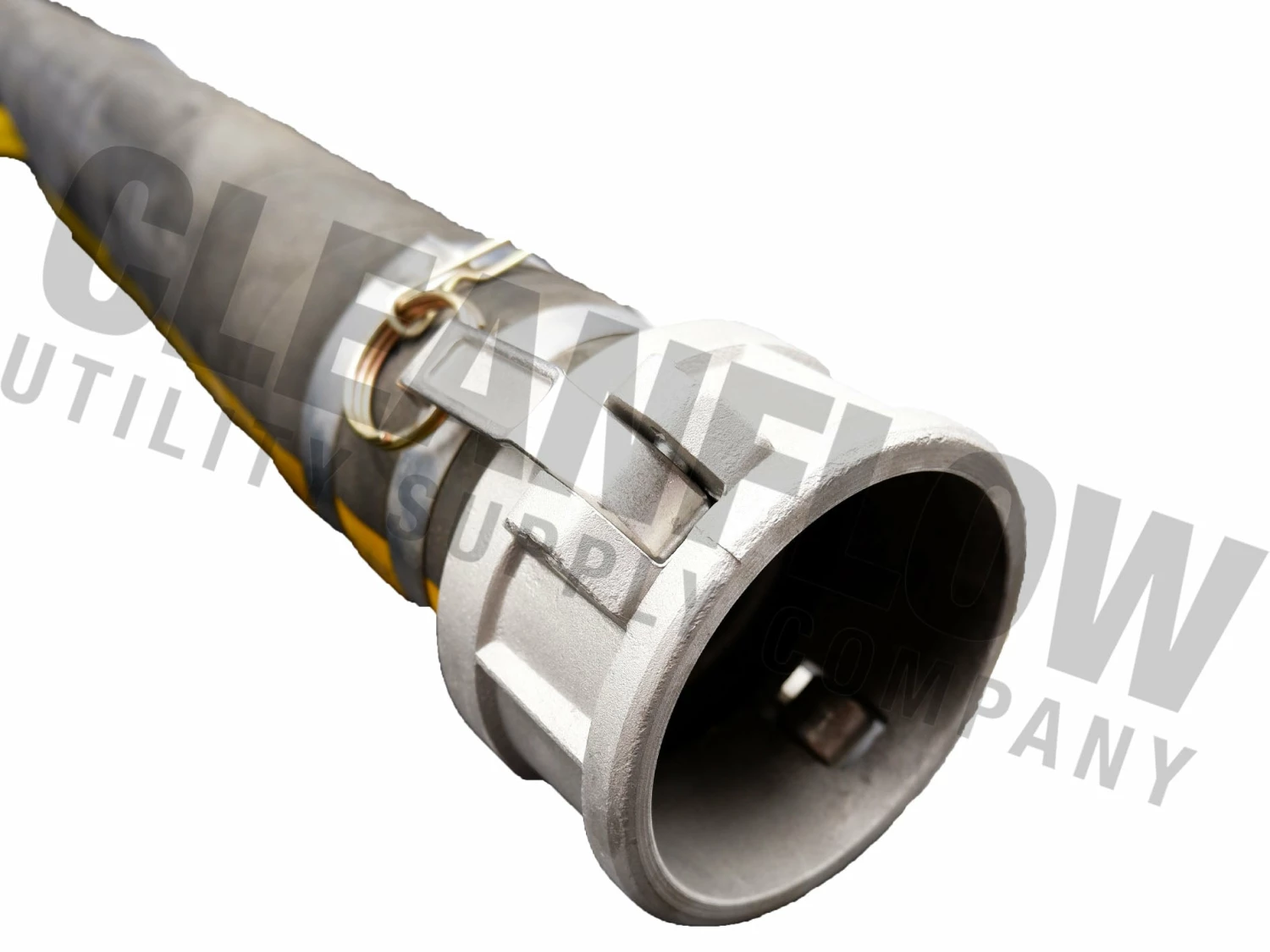 This pre-fabricated discharge hose assembly come complete with aluminum Camlock Type C (female) and Camlock Type E (male) connectors installed. The camlocks are crimped onto the hose for maximum retention and strength.
