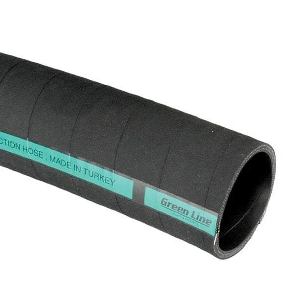 This rubber hose is constructed with a smooth, black rubber tube reinforced by heavy wire helix embedded between layers of synthetic textile cords. It is covered by a black, abrasion resistant wrapped finish. The rubber construction of this suction hose provides excellent resistance to cuts, gouges, and weathering.