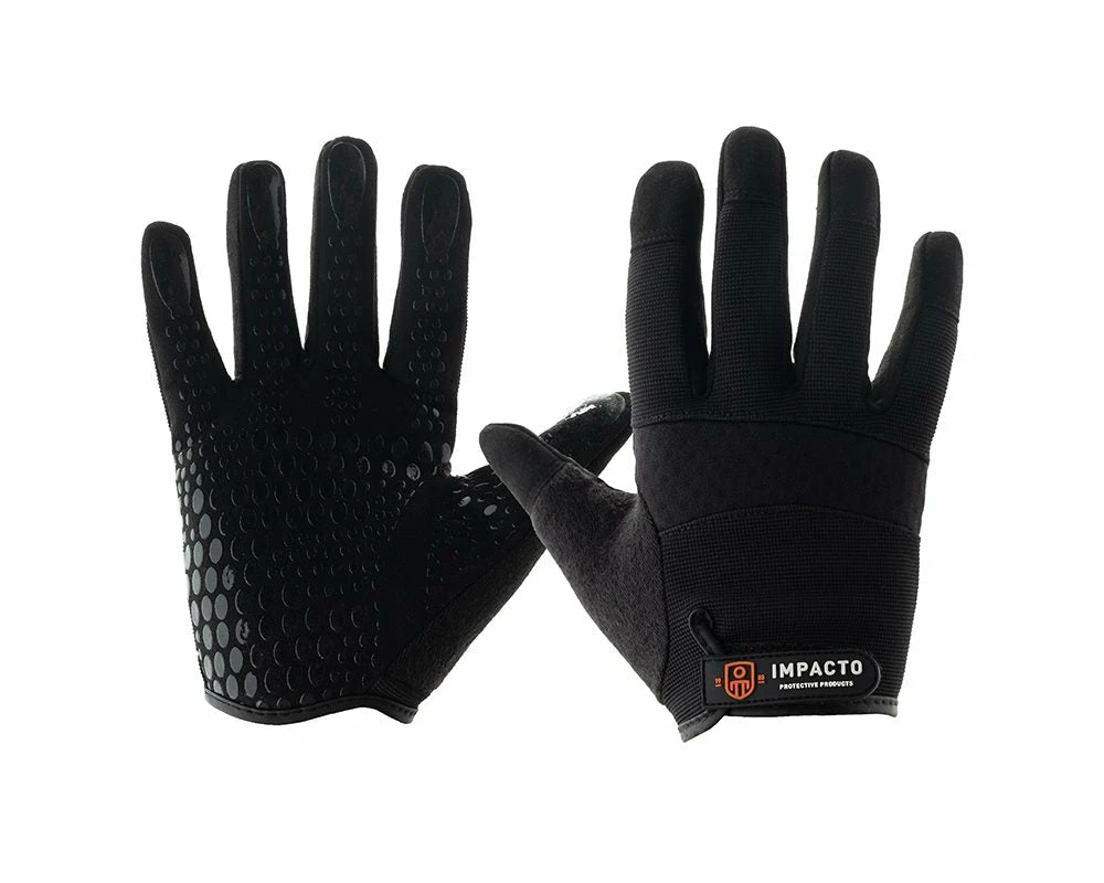 IMPACTO Mechanic Style Work Glove. Full finger, synthetic grey leather palm with black synthetic leather patches. Black synthetic leather on tip of fingers and thumb. Spandex back of fingers and hand. Terry cloth back of thumb. Wrist tab with hook and loop closure.