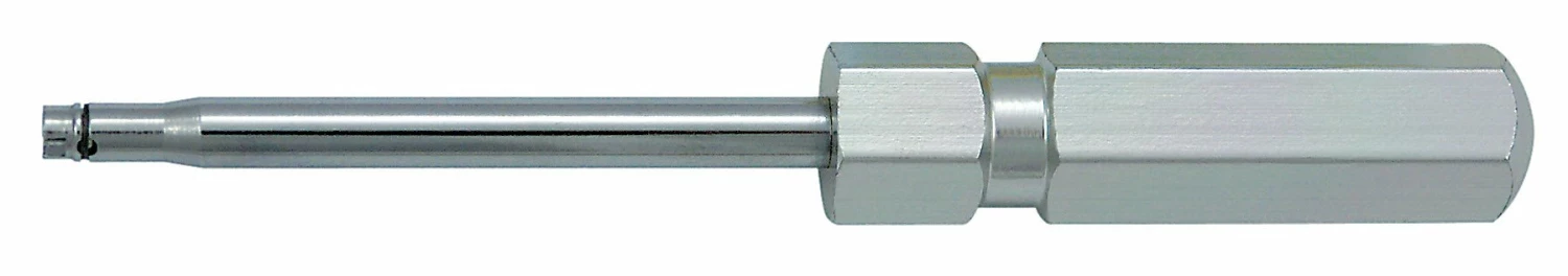 A compact tool with aluminum handle and steel shaft that allows you to remove and install valve cores.