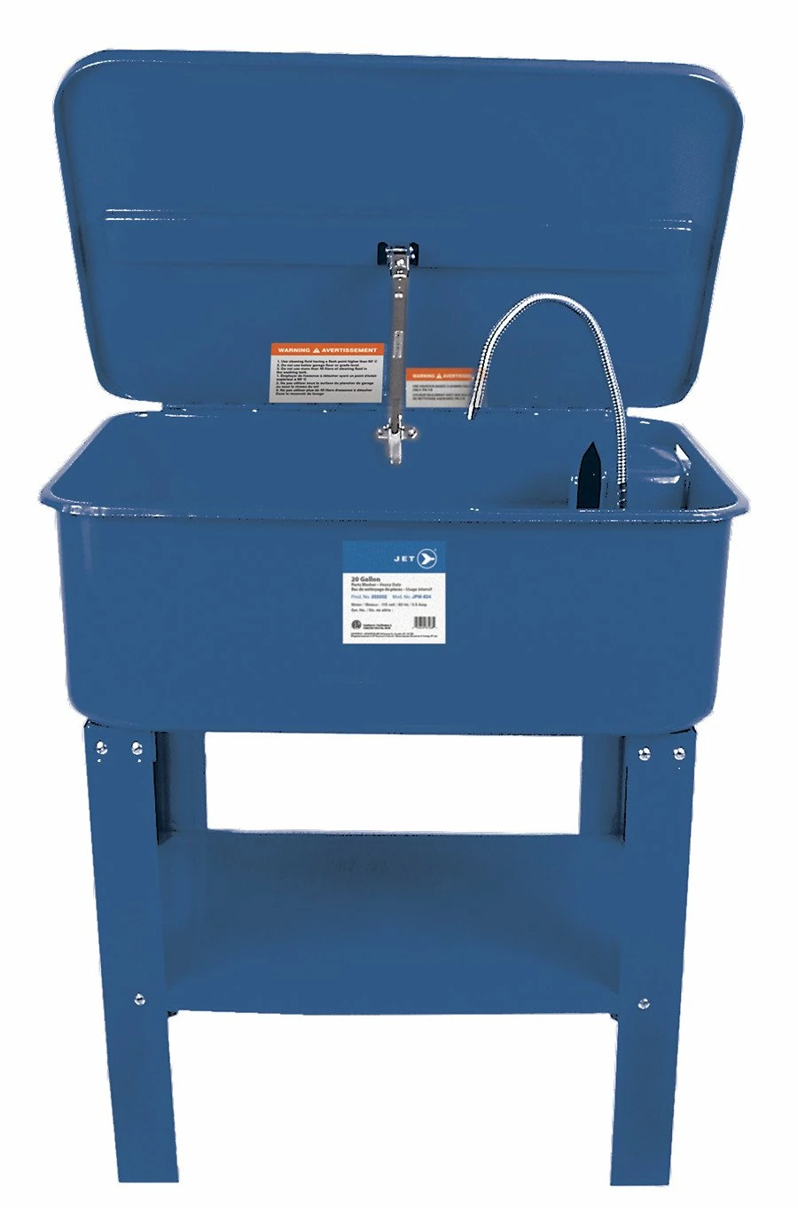 Jet JPW-20 Heavy Duty Parts Washer is for use with water-based cleaning solutions with a flash point of 60C or higher. 45 liter working capacity tank includes basket and work shelf. This parts washer has a flexible delivery spigot and a screened inlet to protect the pump from foreign material.
