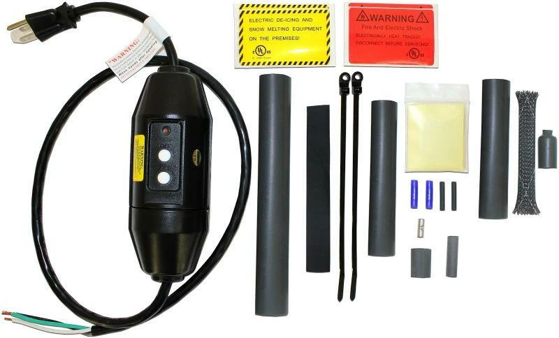 The King Electrical SRK08 Ground Fault Circuit Interruption (GFCI) Plug-in Power Connection Kit contains parts and fittings for making one 120 volt GFCI protected plug connection and one end seal termination on King SR self regulating heating cables.