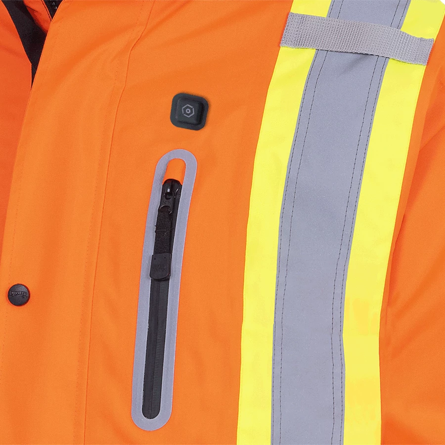 | There are 4 heat settings: 38°C, 43°C, 48°C and 53°C, indicated by coloured LED’s. Select your heat setting by pressing the main switch button. This jacket is compatible with various power banks, refer to the chart below for heating capacity and how many hours of warmth this jacket will provide. |