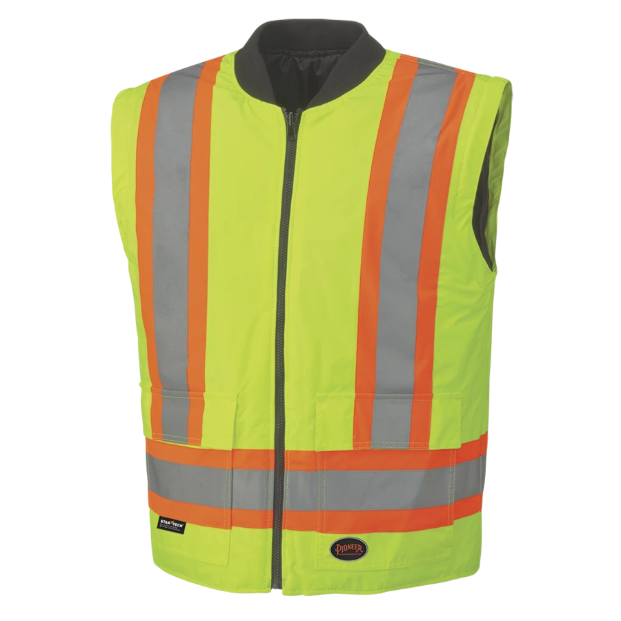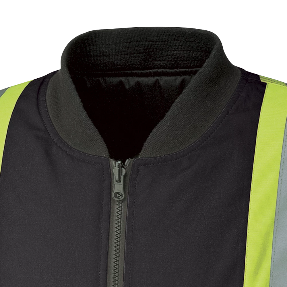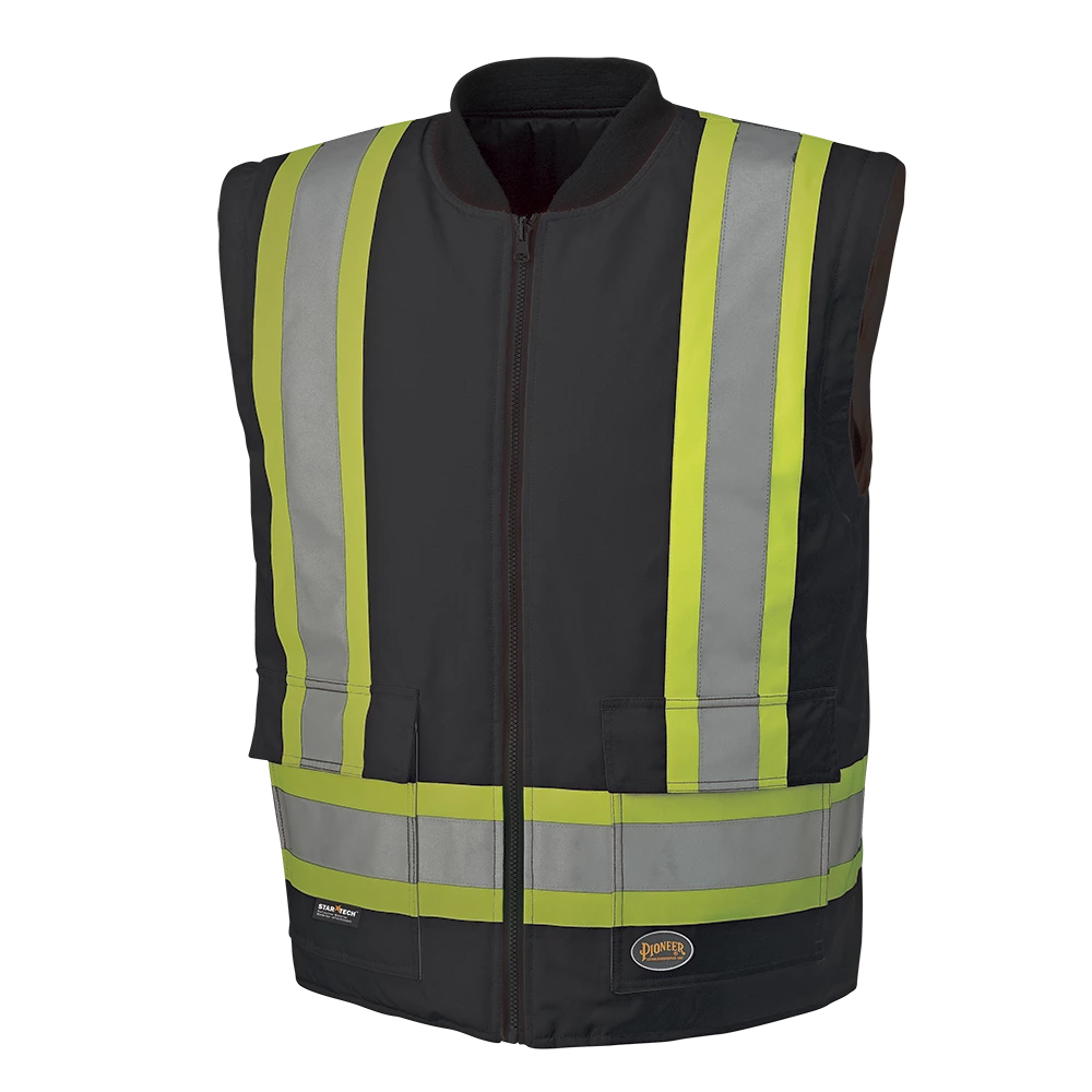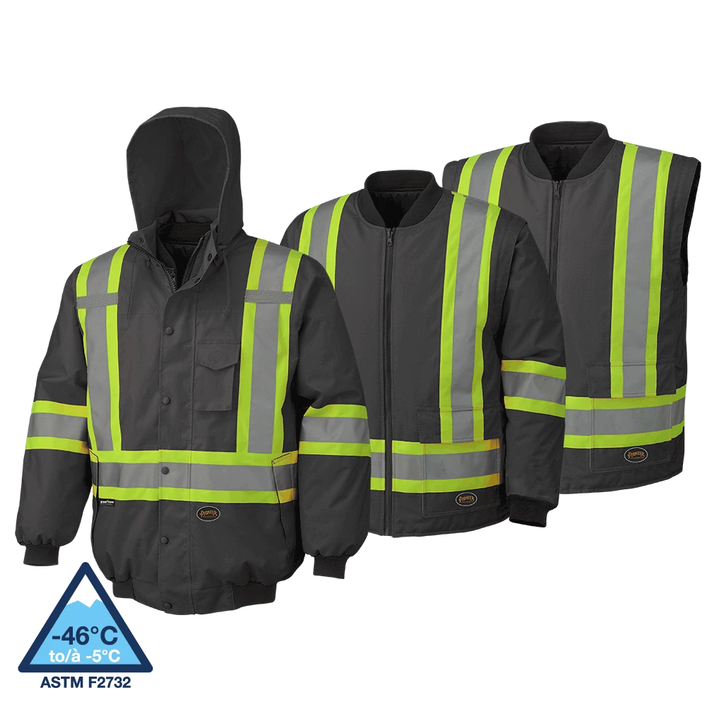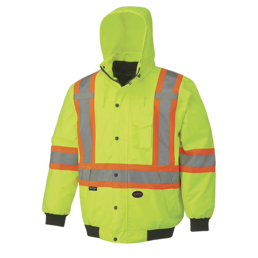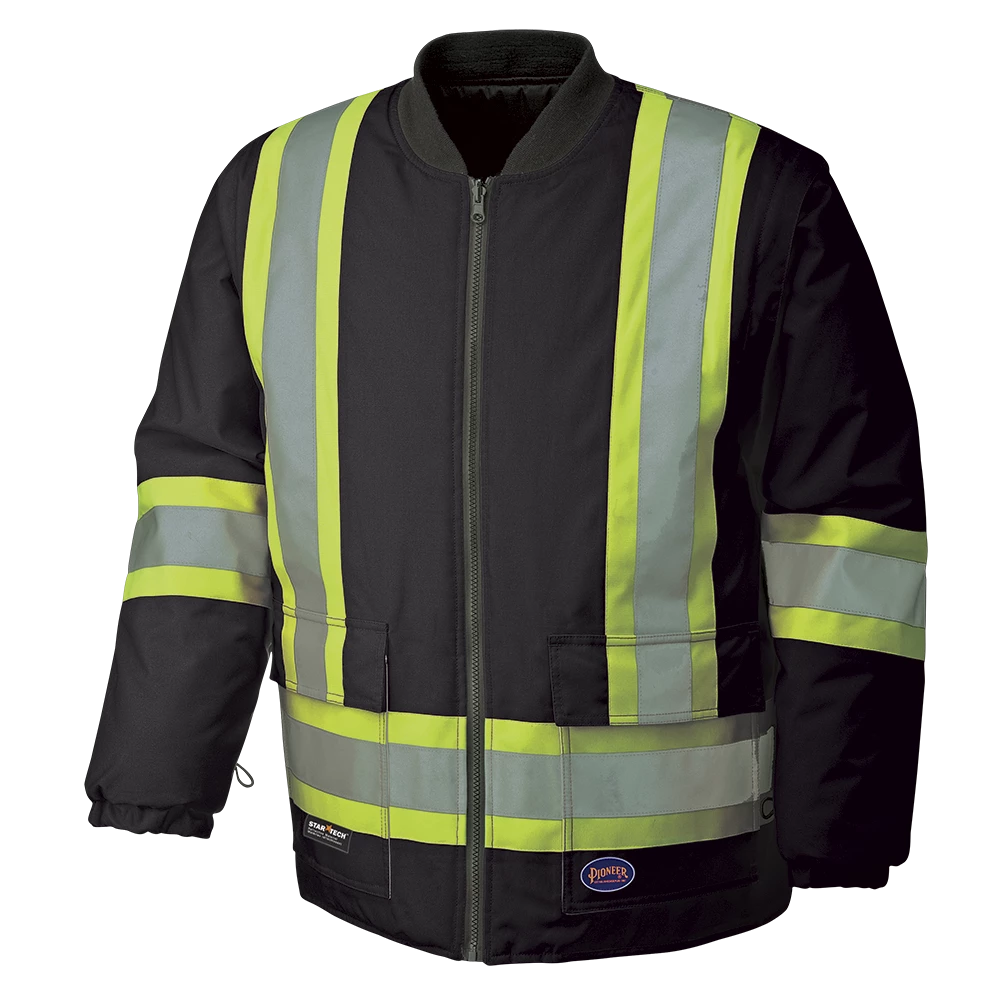 Pioneer’s 6-in-1 reflective striped winter work bomber is highly versatile and employs a unique design that adapts to the weather, your work, and your preferences. The unique black design provides a clean look by helping to hide the effects of contrast with dirt, grease and other soiling materials. 300-Denier oxford 100% polyester outer shell jacket, lining/insulator. Waterproof and windproof Polyurethane (PU) coating on outer shell and inner liner. Taped and heat sealed seams throughout. Equipped with double-stitched Startech reflective striping with 4-inch contrast backing for the ultimate in workplace visibility.