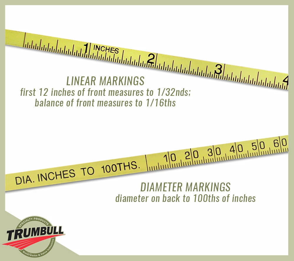 Most competitive models of diameter tapes can measure up to 20″ or 24″ pipe. Trumbull’s tape will measure diameters up to and including 36″ ductile iron pipe!