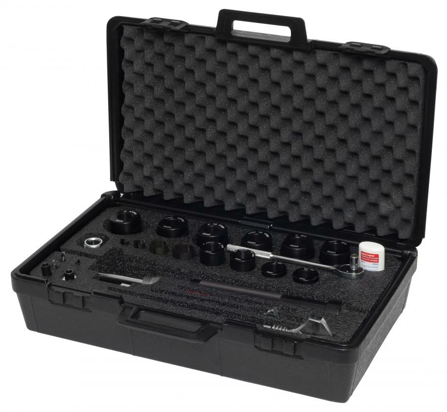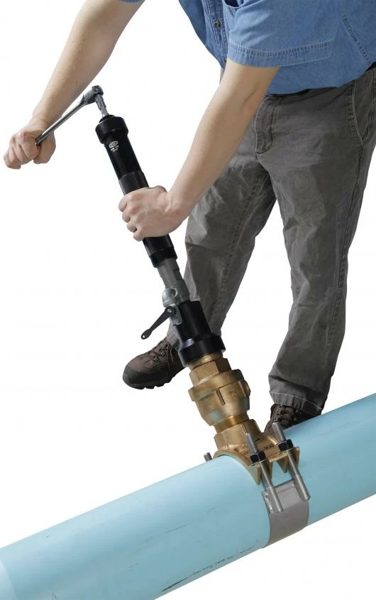 Reed Feed Tap Drilling Machine Kit contains machine, ratchet wrench and socket, corp adapters and cutters to saddle tap plastic pipe only ¾” – 2” for flare, compression and NPT applications.