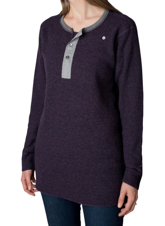 Our heavy weight rib knit wool henley is now available in women’s sizing. Modelled after the much loved mens version, it is made of 80% wool, 20% nylon. This shirt features a double front, military insert shoulders and a 3 button placket with an extra button for securing the neck open.
