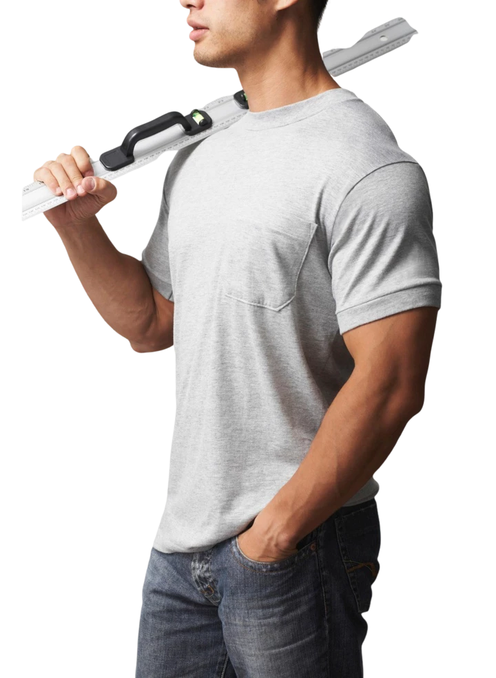 The pocket t-shirt is the ultimate performance work shirt for men. DryFX® technology allows for moisture management and an antimicrobial finish provides permanent odour protection. The jersey knit, blend of soft ring-spun cotton/polyester and taped shoulders and neck provide for comfort and extra durability. This t-shirt features a seamless neckband, large left chest pocket and rib knit cuffs to keep sleeves in place. The generous length means this shirt won’t ride up or pull out. Choose from grey mix, khaki swing, navy or classic white.