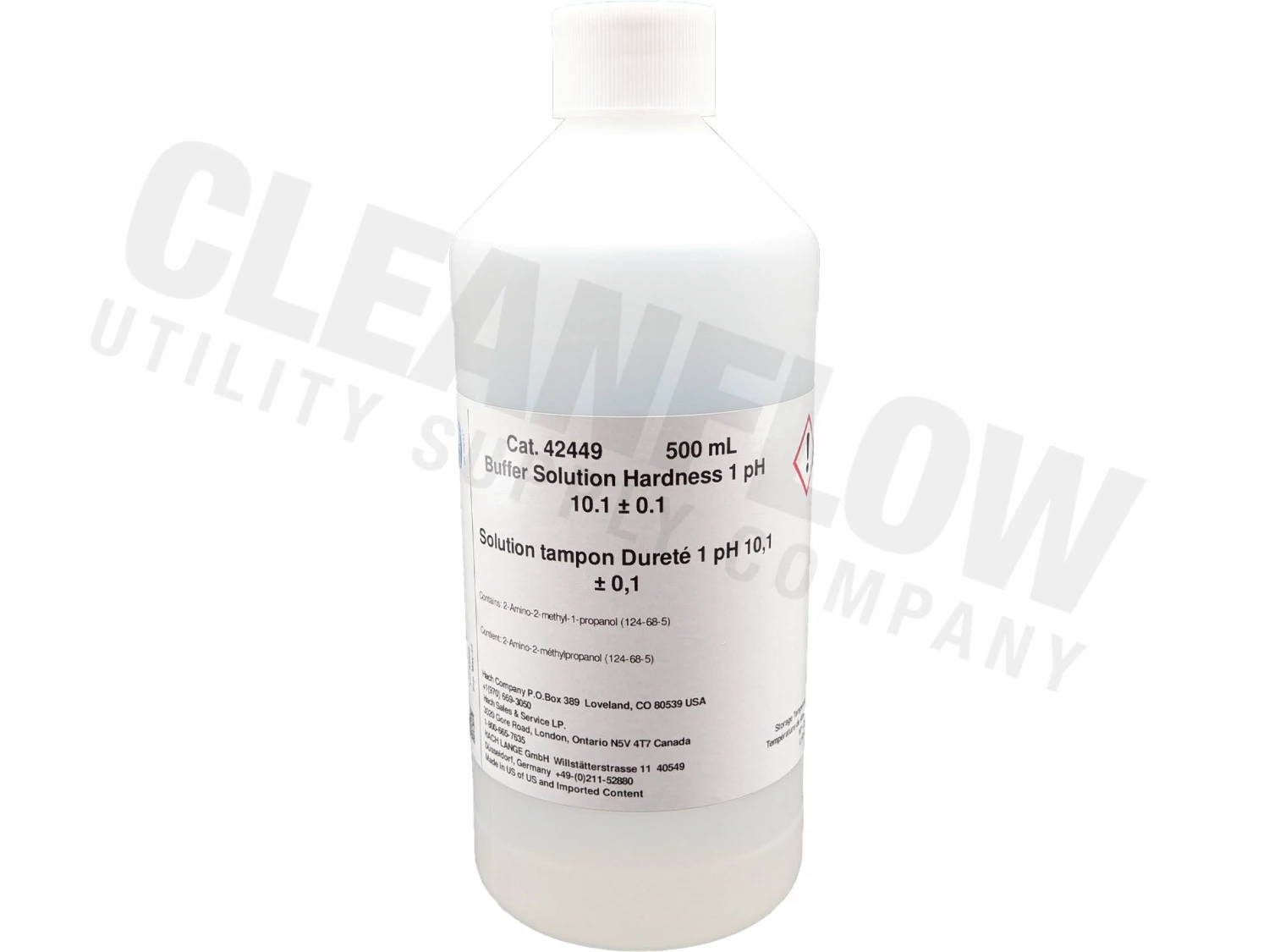 Buffer for hardness and chelant determination by titration, pH 10.1 ± 0.1 at 20°C. Hach methods 8213 and 8226. Also used in Hach Phenols method 8047. 500 mL Bottle