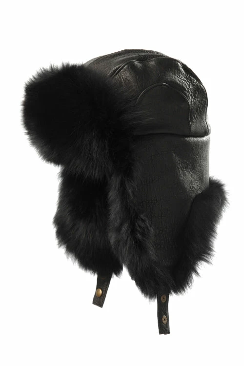 The Crowncap Black Fox Aviator Hat has a French lamb cover, quilt lined, and short domed chin strap.